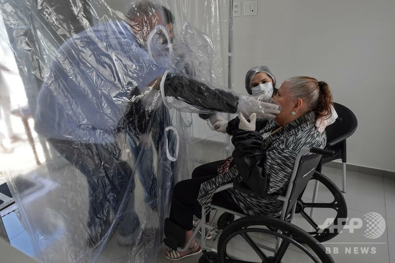サンパウロ(Sao Paulo)市の老人ホームに取り付けられたのは、大きなプラスチック製のカーテンだ。カーテンには入居者と訪問者がそれぞれ腕を入れるための穴が取り付けられており、カーテン越しとはいえ、新型コロナウイルスにより数か月にわたり不可能だった抱擁を交わすことができるようになった。さらなる予防措置として、利用者は手袋と黒いアームカバーも着用する。