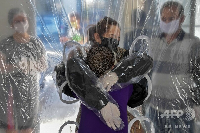 サンパウロ(Sao Paulo)市の老人ホームに取り付けられたのは、大きなプラスチック製のカーテンだ。カーテンには入居者と訪問者がそれぞれ腕を入れるための穴が取り付けられており、カーテン越しとはいえ、新型コロナウイルスにより数か月にわたり不可能だった抱擁を交わすことができるようになった。さらなる予防措置として、利用者は手袋と黒いアームカバーも着用する。