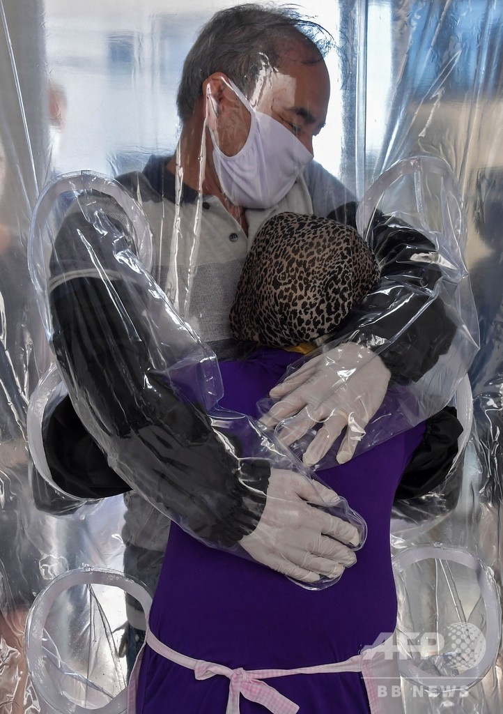 サンパウロ(Sao Paulo)市の老人ホームに取り付けられたのは、大きなプラスチック製のカーテンだ。カーテンには入居者と訪問者がそれぞれ腕を入れるための穴が取り付けられており、カーテン越しとはいえ、新型コロナウイルスにより数か月にわたり不可能だった抱擁を交わすことができるようになった。さらなる予防措置として、利用者は手袋と黒いアームカバーも着用する。