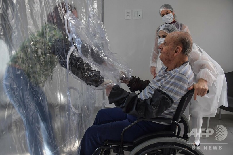 サンパウロ(Sao Paulo)市の老人ホームに取り付けられたのは、大きなプラスチック製のカーテンだ。カーテンには入居者と訪問者がそれぞれ腕を入れるための穴が取り付けられており、カーテン越しとはいえ、新型コロナウイルスにより数か月にわたり不可能だった抱擁を交わすことができるようになった。さらなる予防措置として、利用者は手袋と黒いアームカバーも着用する。