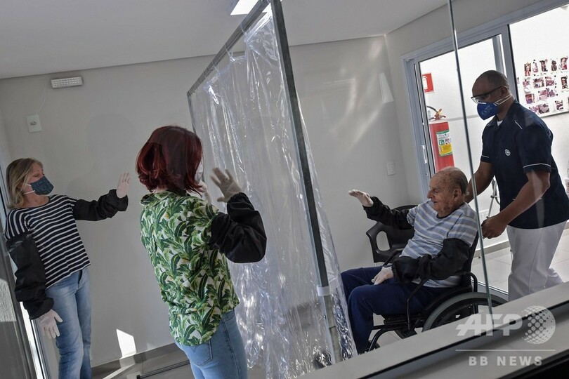 サンパウロ(Sao Paulo)市の老人ホームに取り付けられたのは、大きなプラスチック製のカーテンだ。カーテンには入居者と訪問者がそれぞれ腕を入れるための穴が取り付けられており、カーテン越しとはいえ、新型コロナウイルスにより数か月にわたり不可能だった抱擁を交わすことができるようになった。さらなる予防措置として、利用者は手袋と黒いアームカバーも着用する。