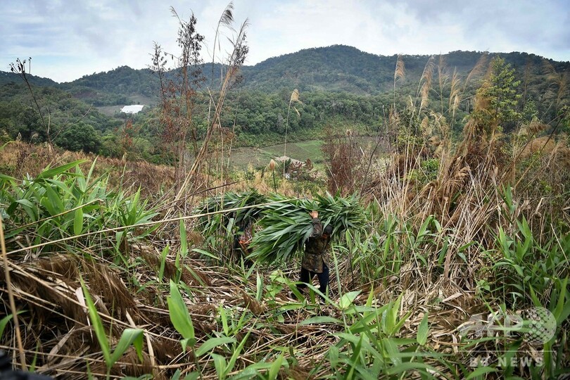 飢えを避けるためにはるばる帰郷したゾウ使いにとって、ゾウの食料として1頭あたり300キロの植物を見つけることは大きな課題だ。代わりに飼料を購入するとなると、1日あたり約500バーツ(約1700円)かかるという。(c)AFP/Pitcha DANGPRASITH and Sophie DEVILLER