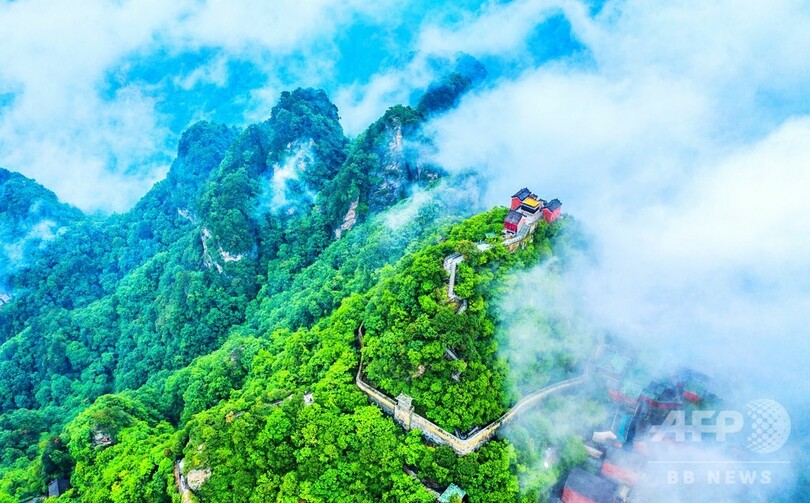【6月22日 CNS】中国・湖北省(Hubei)十堰市(Shiyan)で13日、道教の聖地で武術の発祥地でもある武当山(Wudang Mountains)の山の峰に雲がかかり、道観(どうかん)には金色の瓦が輝き、壮観な光景が広がっていた。(c)CNS/JCM/AFPBB News
