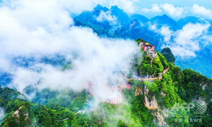 【6月22日 CNS】中国・湖北省(Hubei)十堰市(Shiyan)で13日、道教の聖地で武術の発祥地でもある武当山(Wudang Mountains)の山の峰に雲がかかり、道観(どうかん)には金色の瓦が輝き、壮観な光景が広がっていた。(c)CNS/JCM/AFPBB News