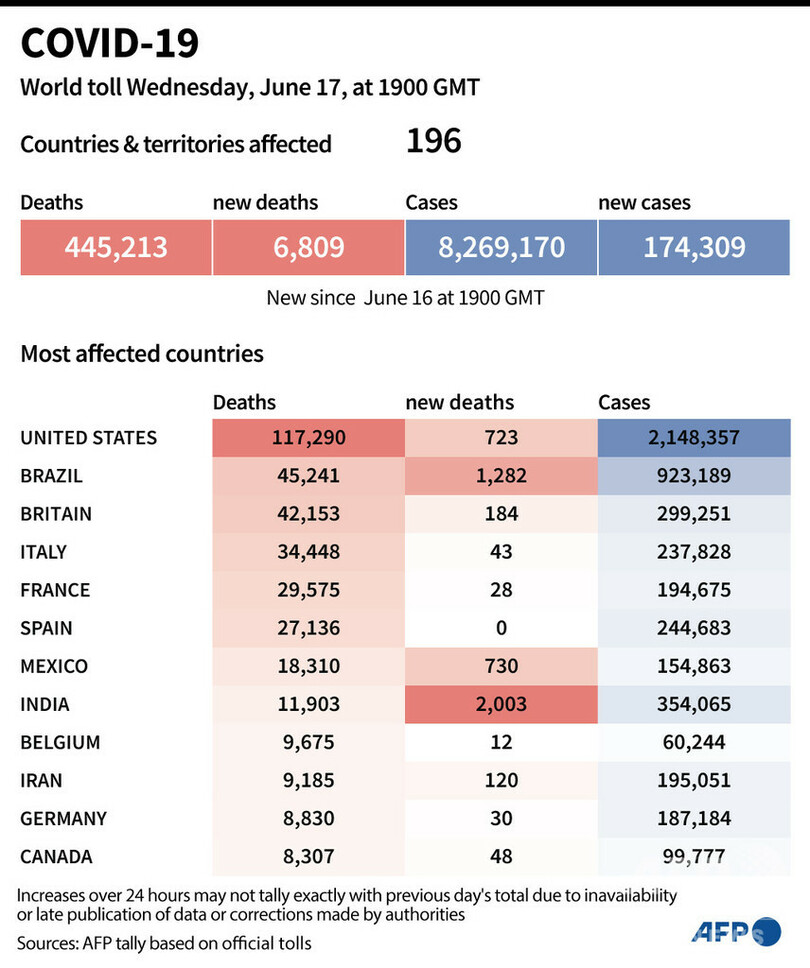 【6月18日 AFP】AFPが各国当局の発表に基づき日本時間18日午前4時にまとめた統計によると、世界の新型コロナウイルスによる死者数は44万5213人に増加した。