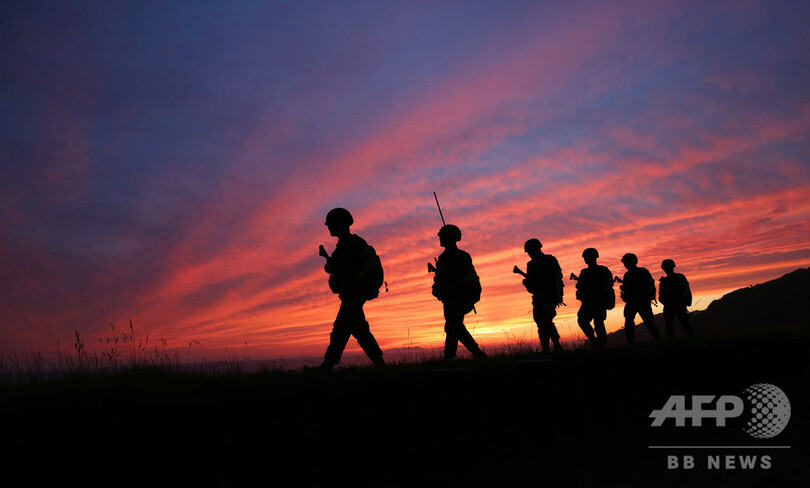 【6月22日 AFP】北朝鮮との黄海(Yellow Sea)上の軍事境界線である北方限界線(NLL)付近の韓国が統治する延坪島(Yeonpyeong Island)で、夕刻にパトロールをする海兵隊員ら。北朝鮮は数回にわたる予告後、南北共同連絡事務所を爆破した。(c)AFP