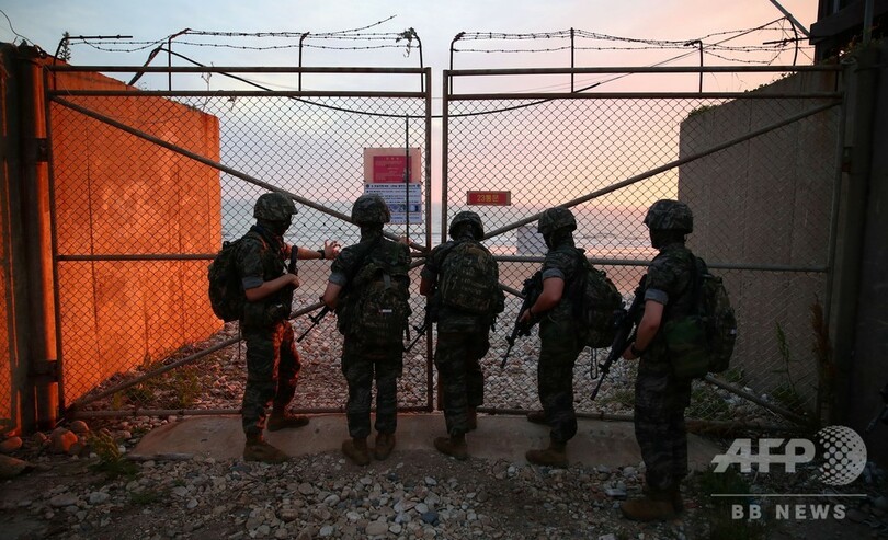 【6月22日 AFP】北朝鮮との黄海(Yellow Sea)上の軍事境界線である北方限界線(NLL)付近の韓国が統治する延坪島(Yeonpyeong Island)で、夕刻にパトロールをする海兵隊員ら。北朝鮮は数回にわたる予告後、南北共同連絡事務所を爆破した。(c)AFP