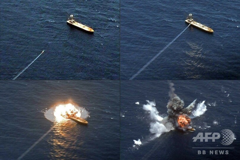 イラン軍は、オマーン湾(Gulf of Oman)で行われた試射の画像をウェブサイトに掲載。画像には軍艦やトラックの後方部からミサイルが発射される様子や、沖合の船が爆発する様子が写っていた。声明によると、短距離および長距離ミサイルが試射された。