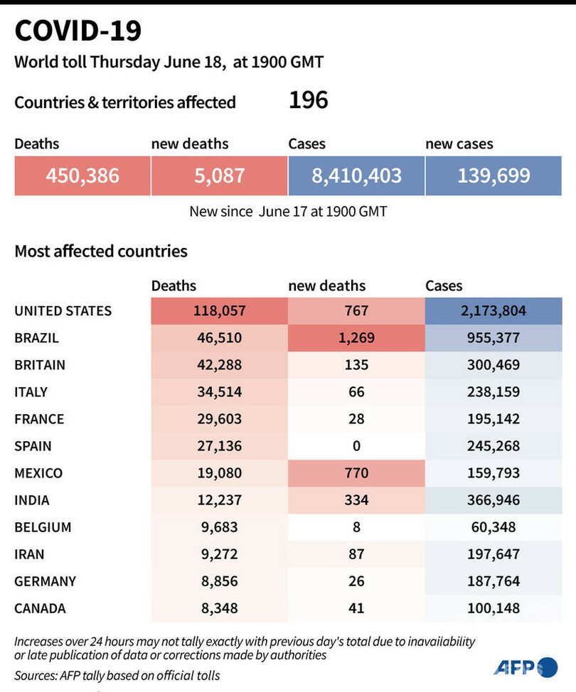 【6月19日 AFP】AFPが各国当局の発表に基づき日本時間19日午前4時にまとめた統計によると、世界の新型コロナウイルスによる死者数は45万386人に増加した。
