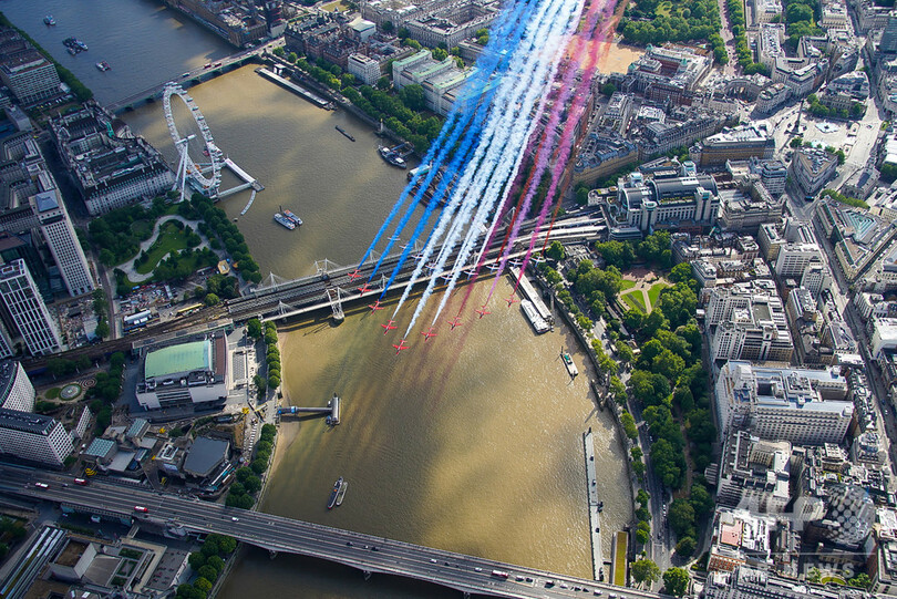 【6月19日 AFP】英仏空軍のアクロバット飛行チームが18日、フランスのシャルル・ドゴール(Charles De Gaulle)将軍(後の仏大統領)の対独抵抗演説80年を記念し、ロンドンとパリで儀礼飛行を行った。
