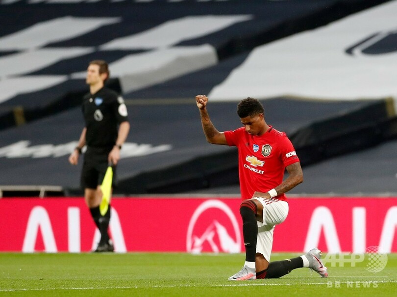 プレミアリーグ再開後のすべての試合と同様、この一戦でもキックオフ前に選手や関係者が膝をつき、人種差別に抗議した。(c)AFP/Kieran CANNING