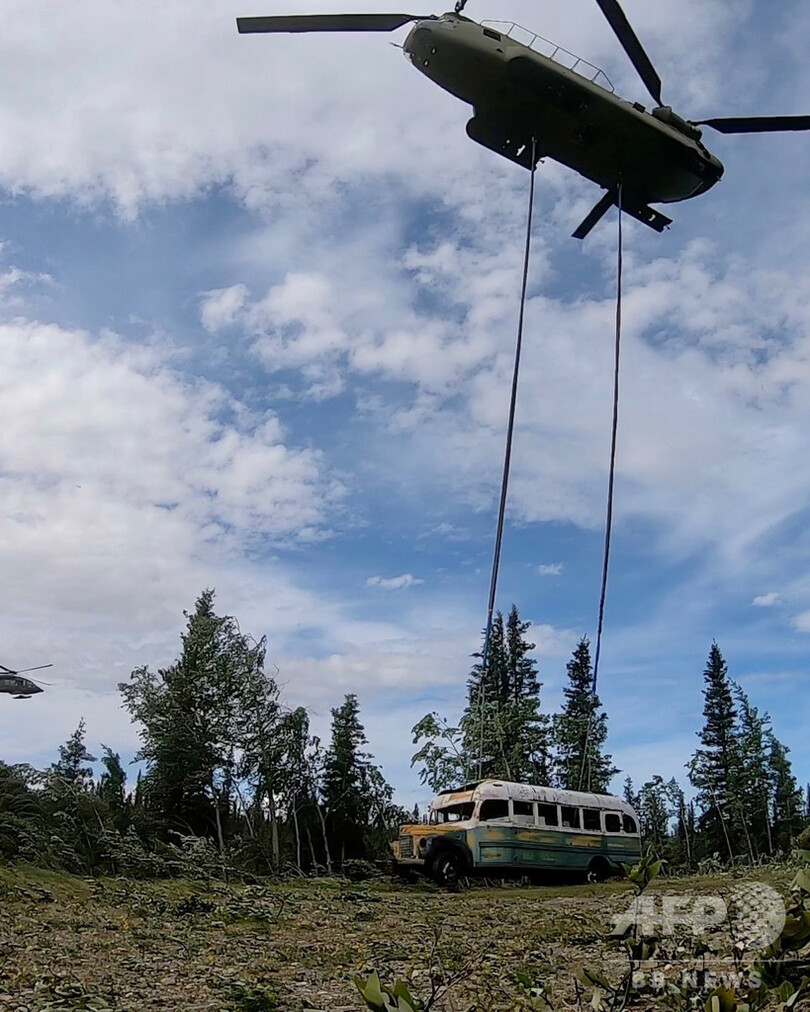 【6月20日 AFP】米アラスカ州の荒野にうち捨てられ、旅行者にとって時には危険な「巡礼地」となっていた1940年代製のバスが18日、同州の軍用ヘリによって撤去された。このバスはジョン・クラカワー(Jon Krakauer)氏による1996年のノンフィクション「荒野へ(Into the Wild)」、また同作をショーン・ペン(Sean Penn)監督が2007年に映画化した『イントゥ・ザ・ワイルド(Into the Wild)』に登場していた。
