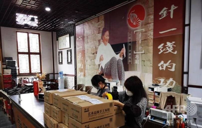 枝江の手作り布靴はEコマースを通じて、東南アジア、欧州、米国にも輸出している。文化村は工房や布靴の展示ホールのほか、観光客向けの実践体験コース、レストラン、宿泊施設もつくり、人気の観光スポットに。2019年には約11万人の観光客と2万人以上の研修グループが訪れ、営業収入は2000万元(約3億円)に上っている。(c)CNS/JCM/AFPBB News