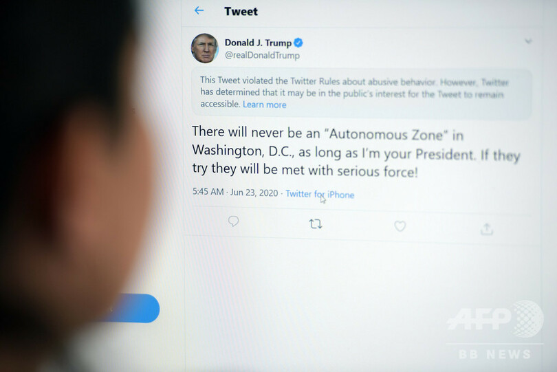 【6月24日 AFP】(更新、写真追加)米交流サイト(SNS)大手ツイッター(Twitter)は23日、米首都ワシントンでのデモに対する実力行使の構えを示したドナルド・トランプ(Donald Trump)大統領の投稿について、「攻撃的」コンテンツを禁じる自社の規則に違反したとして、非表示にした上で警告文を追加した。