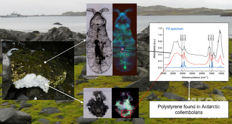 研究チームは赤外線画像化技術を使ってナンキョクトビムシを調べ、ポリスチレンの破片の画像と比較したところ、トビムシの消化管にポリスチレンの形跡があることを「はっきりと」確認した。