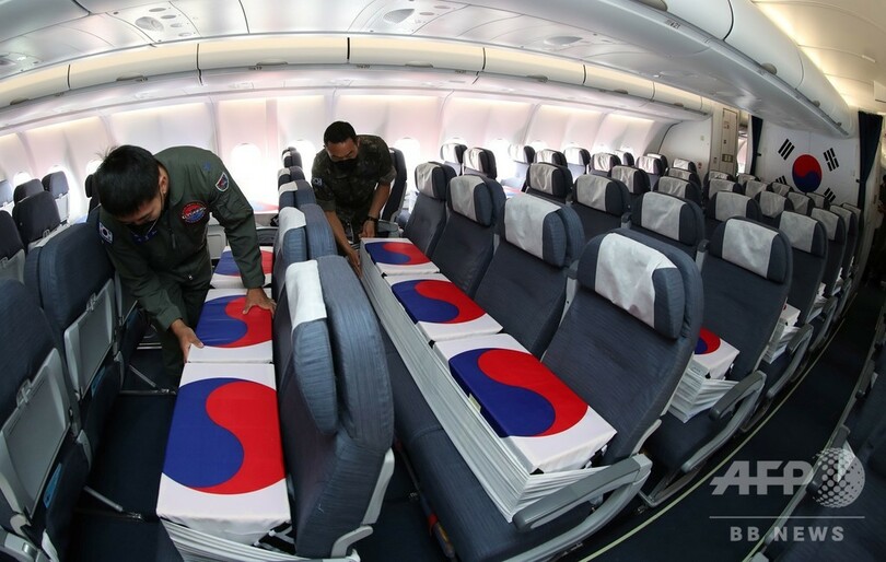 機内を捉えた写真には、兵士一人一人の小さなひつぎが韓国旗に包まれ、各座席に置かれている様子が写っている。