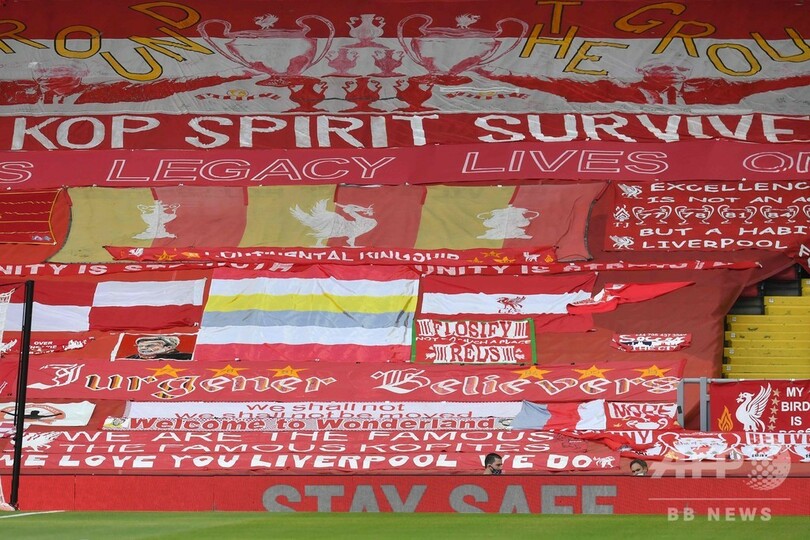 試合前には、ひとけのないアンフィールドに「You'll Never Walk Alone」が流れたが、おなじみである約5万5000人の大合唱は聞かれなかった。その代わりとして、21日のエバートン(Everton)戦で勝利していればリバプールが優勝を決められたこの日、コップ(Kop、ゴール裏のスタンド)はバナーやフラッグで覆われていた。(c)AFP