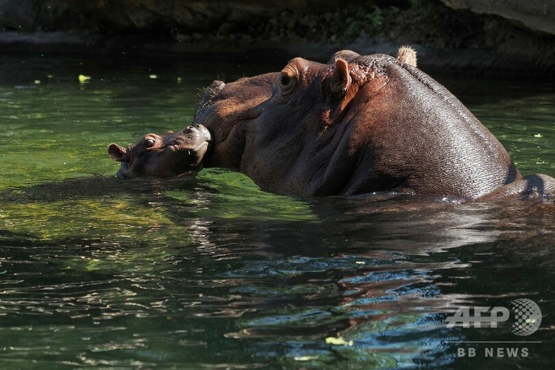 【6月26日 AFP】フランス中部サンテニャンシュルシェール(Saint-Aignan-sur-Cher)のボーバル動物園(Zooparc of Beauval)で今月7日に誕生した雌のカバの赤ちゃん、グロリア。母親と一緒に水中を泳ぐ姿は子どもから大人までを魅了している。(c)AFP