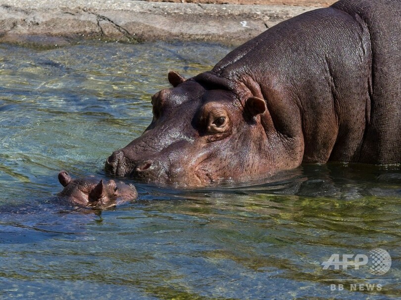 【6月26日 AFP】フランス中部サンテニャンシュルシェール(Saint-Aignan-sur-Cher)のボーバル動物園(Zooparc of Beauval)で今月7日に誕生した雌のカバの赤ちゃん、グロリア。母親と一緒に水中を泳ぐ姿は子どもから大人までを魅了している。(c)AFP