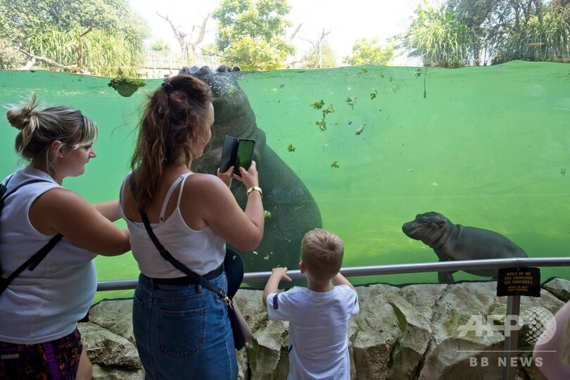 【6月26日 AFP】フランス中部サンテニャンシュルシェール(Saint-Aignan-sur-Cher)のボーバル動物園(Zooparc of Beauval)で今月7日に誕生した雌のカバの赤ちゃん、グロリア。母親と一緒に水中を泳ぐ姿は子どもから大人までを魅了している。(c)AFP