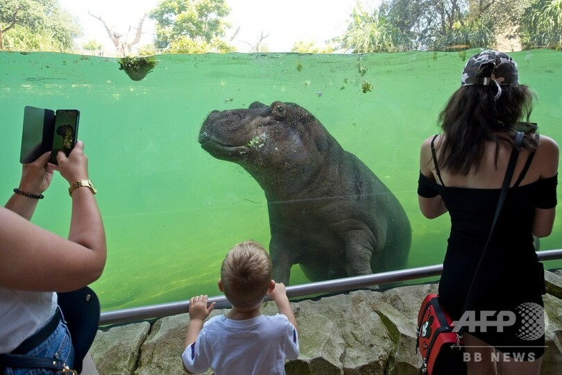 【6月26日 AFP】フランス中部サンテニャンシュルシェール(Saint-Aignan-sur-Cher)のボーバル動物園(Zooparc of Beauval)で今月7日に誕生した雌のカバの赤ちゃん、グロリア。母親と一緒に水中を泳ぐ姿は子どもから大人までを魅了している。(c)AFP