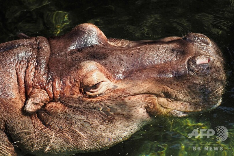【6月26日 AFP】フランス中部サンテニャンシュルシェール(Saint-Aignan-sur-Cher)のボーバル動物園(Zooparc of Beauval)で今月7日に誕生した雌のカバの赤ちゃん、グロリア。母親と一緒に水中を泳ぐ姿は子どもから大人までを魅了している。(c)AFP