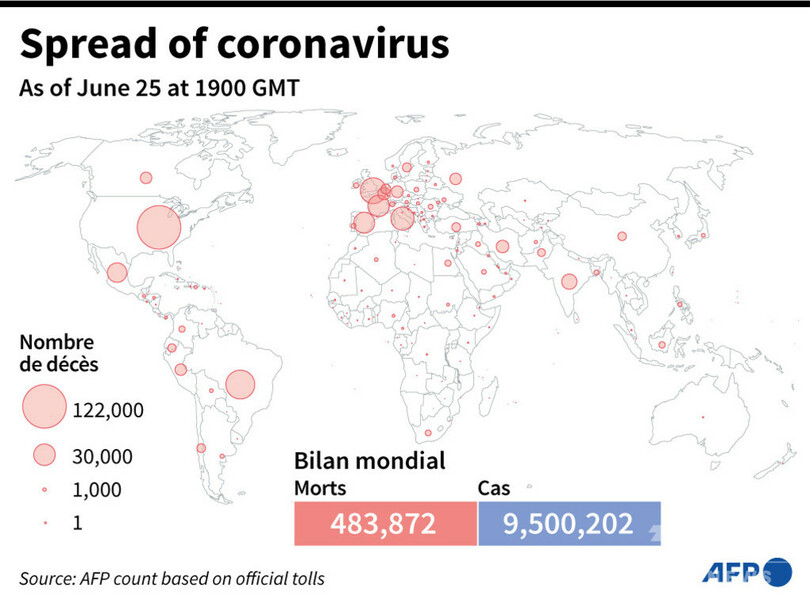 【6月26日 AFP】AFPが各国当局の発表に基づき日本時間26日午前4時にまとめた統計によると、世界の新型コロナウイルスによる死者数は48万3872人に増加した。