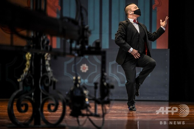 新型コロナウイルスの感染拡大により、フェスティバルは特例措置のもとで実施された。観客がいない中、ダンサーはマスクを着け、グループ演技では対人距離を保ちながら、新設のソロ部門ではパートナーなしで踊らねばならない。パフォーマンスは録画され、地元テレビで放送される。(c)AFP