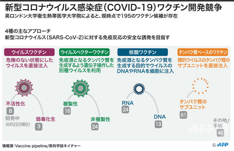 【6月26日 AFP】数多くの薬剤の試験が実施され、ワクチン候補は100を超える──。現在も多くの臨床試験が続く中、この記事では新型コロナウイルス感染症(COVID-19)の治療薬や予防法に向けた主要な研究開発の概要を報告する。