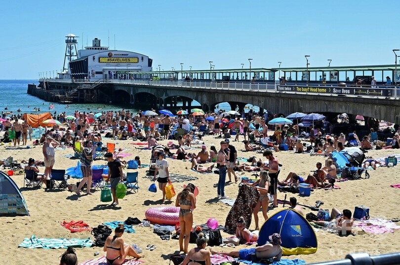 【6月26日 AFP】英国では25日、今年最高の暑さを記録し、新型コロナウイルス感染のリスクをよそに海辺の観光地に大勢の人が詰め掛けた。数千人が押し寄せたイングランド南部の港町ボーンマス(Bournemouth)では、市当局が緊急事態を宣言し、観光客に来訪を控えるよう呼び掛けている。