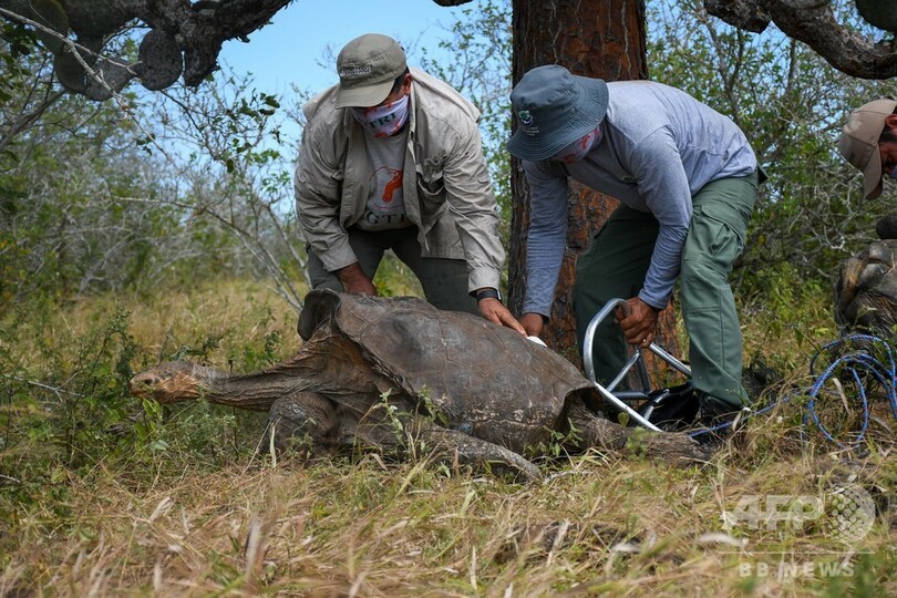 【7月4日 AFP】エクアドル領ガラパゴス諸島(Galapagos Islands)のエスパニョーラ(Espanola)島で、ガラパゴス国立公園(Galapagos National Park)のレンジャーに背負われて、海岸から2.5キロの内陸へ連れて来られたエスパニョーラゾウガメの「ディエゴ(Diego)」。