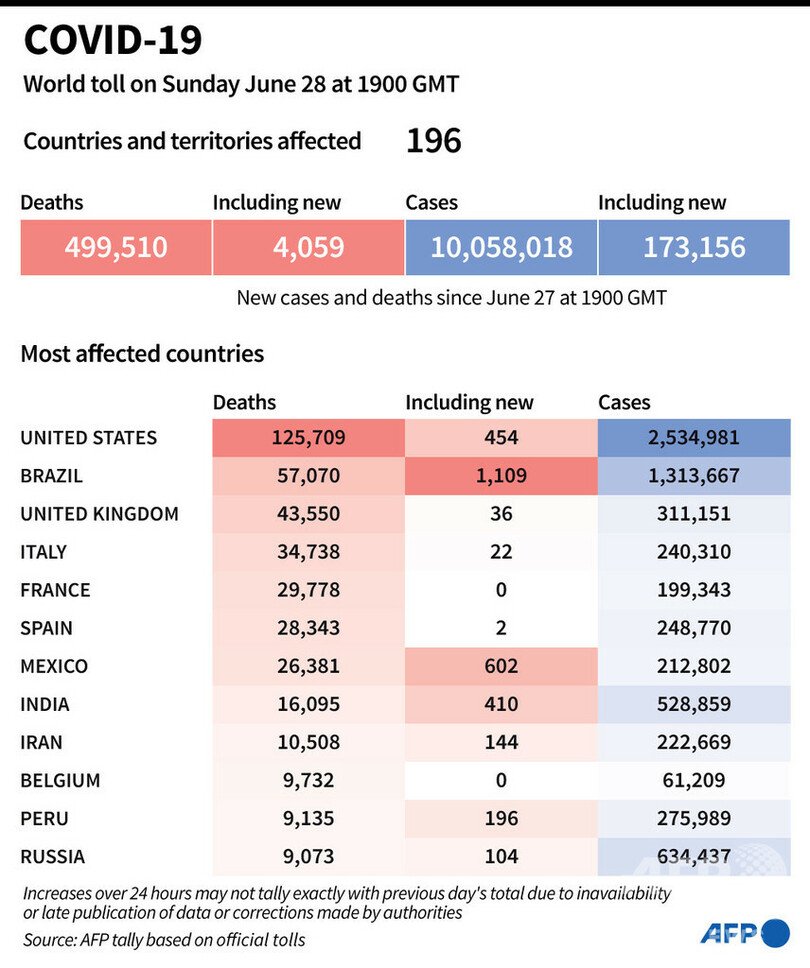 【6月29日 AFP】AFPが各国当局の発表に基づき日本時間29日午前4時にまとめた統計によると、世界の新型コロナウイルスによる死者数は49万9510人に増加した。