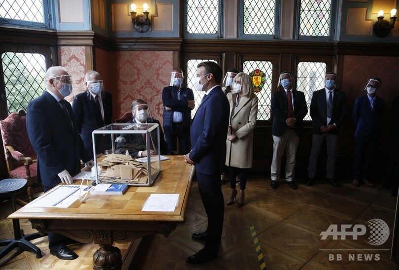 新型コロナウイルスの感染を防ぐため、有権者にはマスクの着用とペンの持参が呼び掛けられた。感染防止用のフェースガードを着けた有権者や選挙職員の姿が多く見られた。南米の仏領ギアナ(Guiana)は、新型コロナウイルス流行が激しすぎるとして唯一今回の投票の実施が見送られた。(c)AFP/Mariëtte Le Roux and Stuart Williams