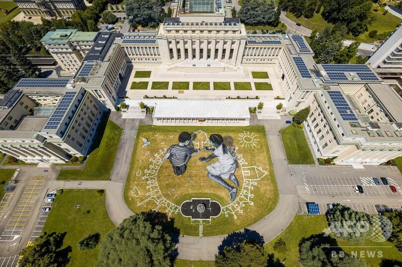 【6月29日 AFP】スイス・ジュネーブの国連(UN)事務局の前庭に、大きさ約6000平方メートルの巨大なアート作品が登場した。タイトルは「ワールド・イン・プログレス(World in Progress、制作中の世界の意)」で、理想の世界を描く2人の子どもが表現されている。