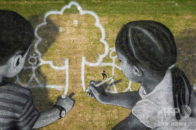 【6月29日 AFP】スイス・ジュネーブの国連(UN)事務局の前庭に、大きさ約6000平方メートルの巨大なアート作品が登場した。タイトルは「ワールド・イン・プログレス(World in Progress、制作中の世界の意)」で、理想の世界を描く2人の子どもが表現されている。