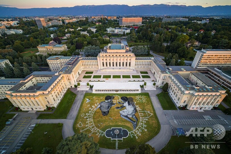 【6月29日 AFP】スイス・ジュネーブの国連(UN)事務局の前庭に、大きさ約6000平方メートルの巨大なアート作品が登場した。タイトルは「ワールド・イン・プログレス(World in Progress、制作中の世界の意)」で、理想の世界を描く2人の子どもが表現されている。