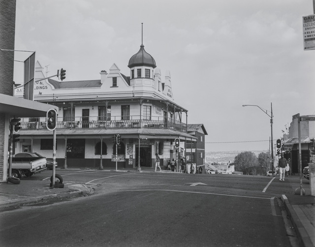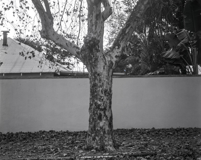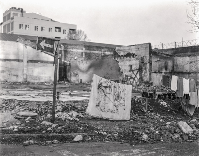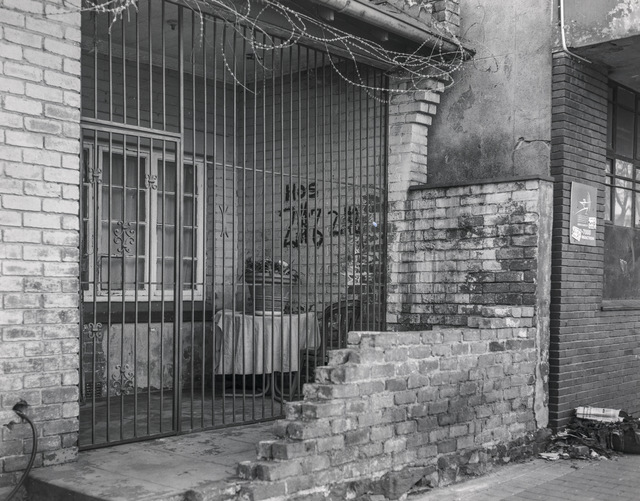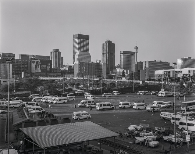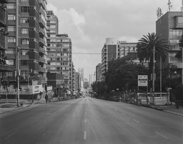 ヒルブロウはヨハネスブルクの最も古い地区の一つで、起源は1880年代にさかのぼる。その頃からは少し変わったが、今もなお、街を横切る山の尾根からは素晴らしい眺めが広がっている。街の中心部の方を向けば、視界に入るのは人のいない大通りと、その背景にあるビル群だ。私は通りの真ん中に撮影場所を設置し、写真を撮るために冠布をかぶった。自分だけの天地逆転の世界に閉じこもり、静寂を味わう。恵みの一時であり、めったにない機会だった。冠布の外に出たときに初めて、自分が衆目を集めていたことに気が付いた。20人ほどが背後のビルの窓からこちらを見ている。こうしたことは何度か起きた。人々は、こちらがしていることの意図を理解しているかのように、私の周りでそっと動いた。