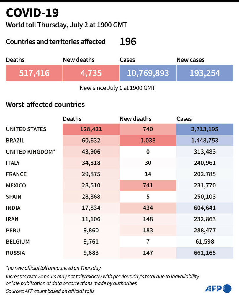 【7月3日 AFP】AFPが各国当局の発表に基づき日本時間3日午前4時にまとめた統計によると、世界の新型コロナウイルスによる死者数は51万7416人に増加した。