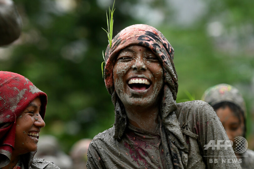 【7月8日 AFP】ネパール・カトマンズ郊外の村トッカ(Tokha)で「田植えの日(National Paddy Day)」に泥だらけになって笑う女性。