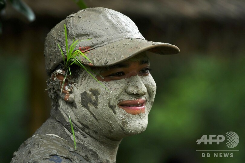 【7月8日 AFP】ネパール・カトマンズ郊外の村トッカ(Tokha)で「田植えの日(National Paddy Day)」に泥だらけになって笑う女性。