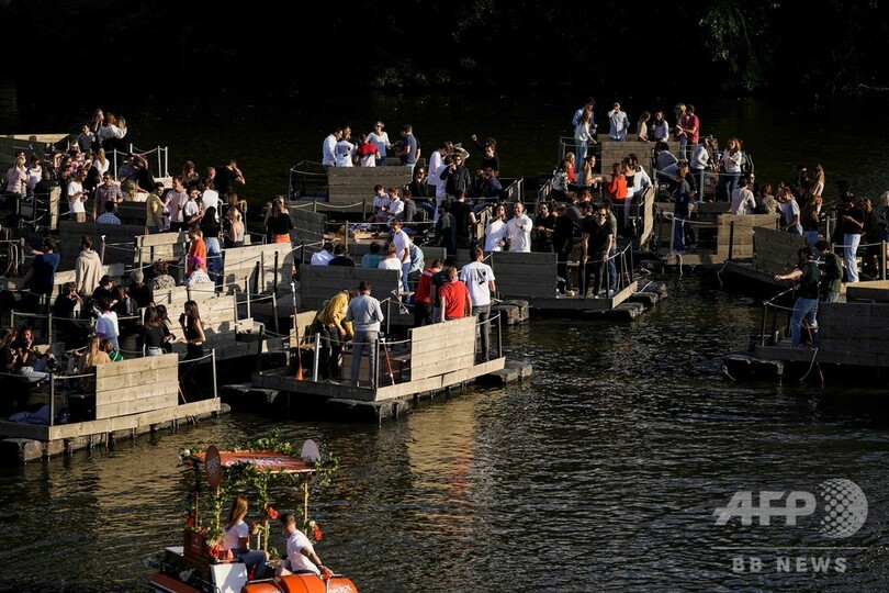 大規模な催しは新型コロナの影響で中止を余儀なくされたものの、観客がいかだに乗って参加する特別版として開催され、厳しいルールが課される中、極めて少数の招待客らが参加した。(c)AFP