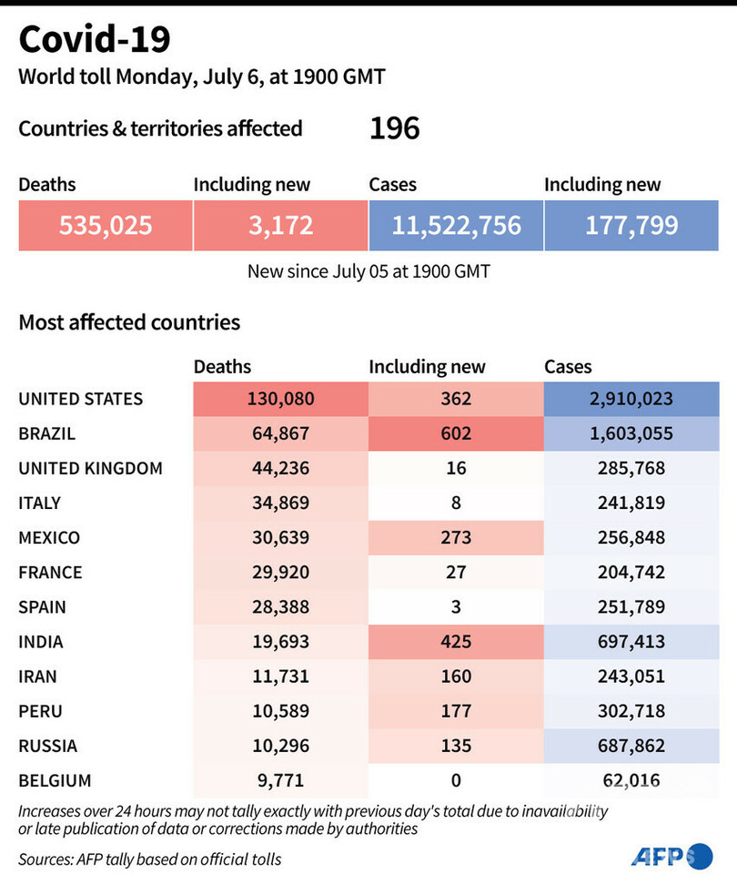 【7月7日 AFP】AFPが各国当局の発表に基づき日本時間7日午前4時にまとめた統計によると、世界の新型コロナウイルスによる死者数は53万5025人に増加した。