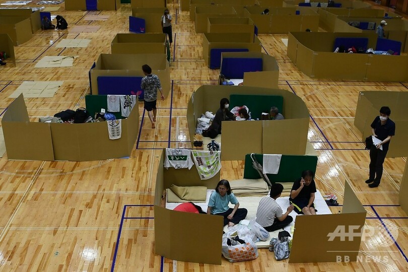 避難はまた新型コロナウイルス感染の懸念にも阻まれている。各地の避難所では人同士の間隔を空けるために、世帯ごとに区切るパーテーションが設置され、避難してきた住民はマスクを着用し、手洗いや消毒を頻繁にしている。(c)AFP/Charly TRIBALLEAU