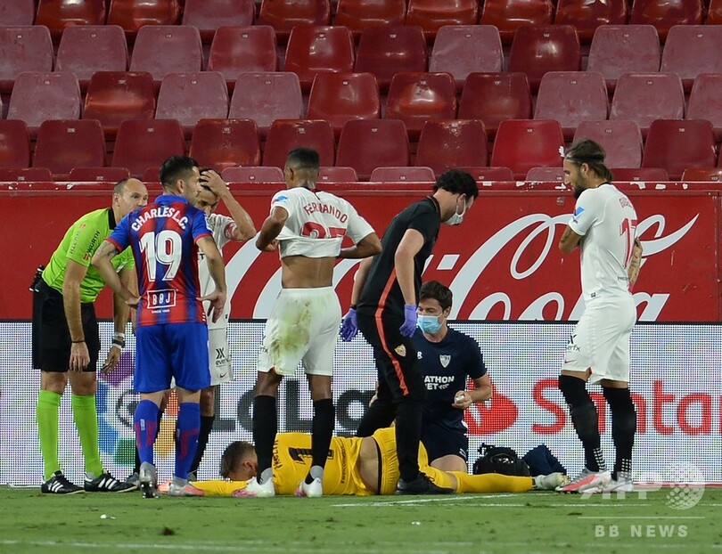その後、終盤にセビージャのGKトマーシュ・バツリーク(Tomas Vaclik)が負傷退場となったが、代役としてゴールマウスに立ったオカンポスが相手のシュートを止める場面もあった。(c)AFP