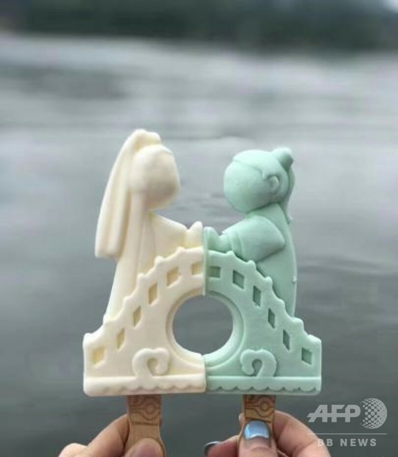 このうち「断橋相会」は、「白蛇伝」のヒロインが西湖の断橋で夫と出会うシーンを表現。アイスは女性と男性が別々のバーに分かれており、2本を合わせると「再会」を果たすというユニークなアイデアだ。(c)CNS/JCM/AFPBB News