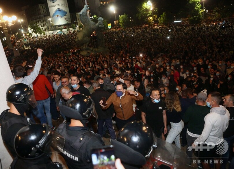 首都中心部で行われたデモの参加者らは、政府の新型コロナウイルス危機への対応を批判した。セルビアは2か月前に最初のロックダウン(都市封鎖)を解除したが、現在感染者数が急増している。