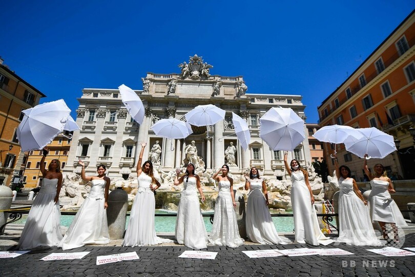 【7月15日 AFP】イタリア・ローマにあるトレビの泉(Trevi Fountain)の近くで、結婚式の延期に抗議して、ウエディングドレス姿でフラッシュモブを行う花嫁たち。