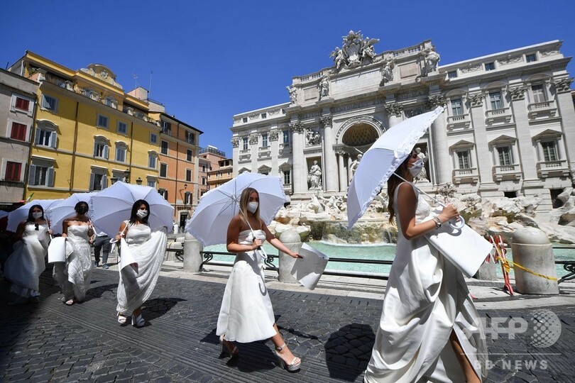【7月15日 AFP】イタリア・ローマにあるトレビの泉(Trevi Fountain)の近くで、結婚式の延期に抗議して、ウエディングドレス姿でフラッシュモブを行う花嫁たち。