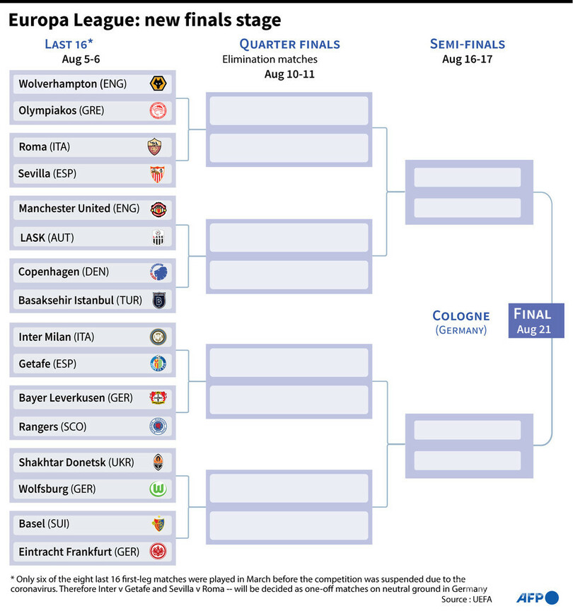 今季のヨーロッパリーグは新型コロナウイルスの影響で3月から中断しており、準々決勝以降は8月にドイツで集中開催される。ケルン(Cologne)、デュイスブルク(Duisburg)、デュッセルドルフ(Duesseldorf)、ゲルゼンキルヘン(Gelsenkirchen)が舞台となる準々決勝と準決勝は一発勝負で行われ、決勝はケルンで8月21日に予定されている。