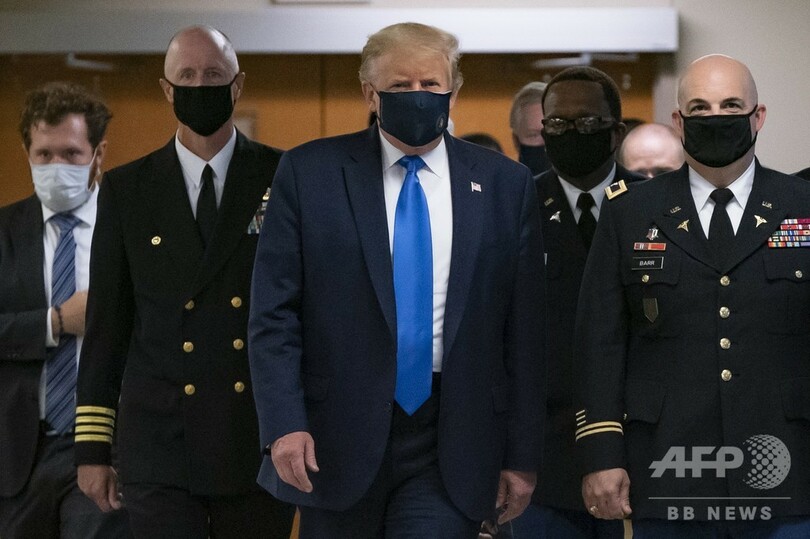 トランプ氏は負傷した米兵たちを見舞うため首都ワシントン郊外にあるウォルター・リード米軍医療センター(Walter Reed National Military Medical Center)を訪れ、大統領の紋章があしらわれた黒いマスクを着用して同センターの廊下を歩いた。